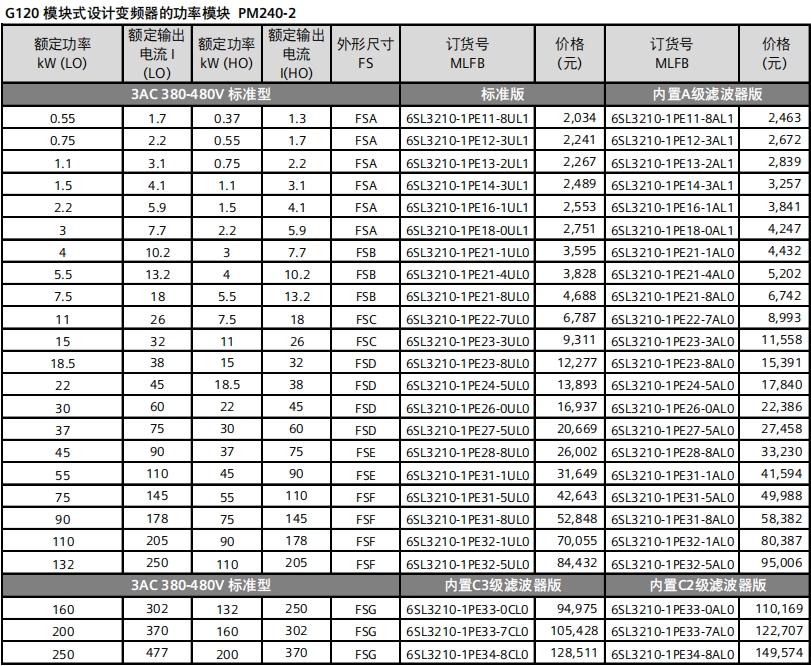 SINAMICS power module PM240-2 with integrated A-class filter and integrated brake chopper 380-480V+10/-10% three-phase AC 47-63Hz heavy overload power: 0.37kW at 200% 3S, 150% 57S, 100% 240S; Environmental temperature -10 to+50 ° C; Power light overload: 0.55kW for 150% 3S, 110% 57S, 100% 240S; Environmental temperature -10 to+40 ° C 196x 73x 165 (height x width x depth), FSA protection level IP20, without control unit and operation unit approved, licensed from CU firmware version 4.6 onwards